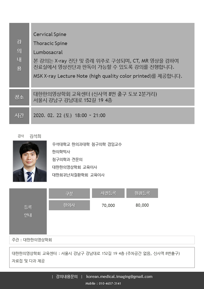 | Musculoskeletal X-ray Lecture 2018 [1기 정규과정 등록마감] (0) | 2018.09.21 |
